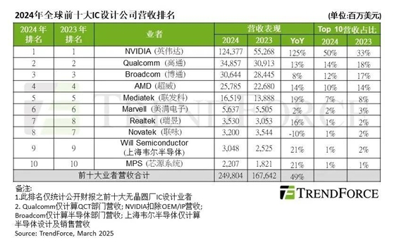 根據(jù)TrendForce集邦咨詢公布的數(shù)據(jù),2024年全球前十大IC設(shè)計(jì)業(yè)者營(yíng)收合計(jì)約 2498億美元,年增49%。